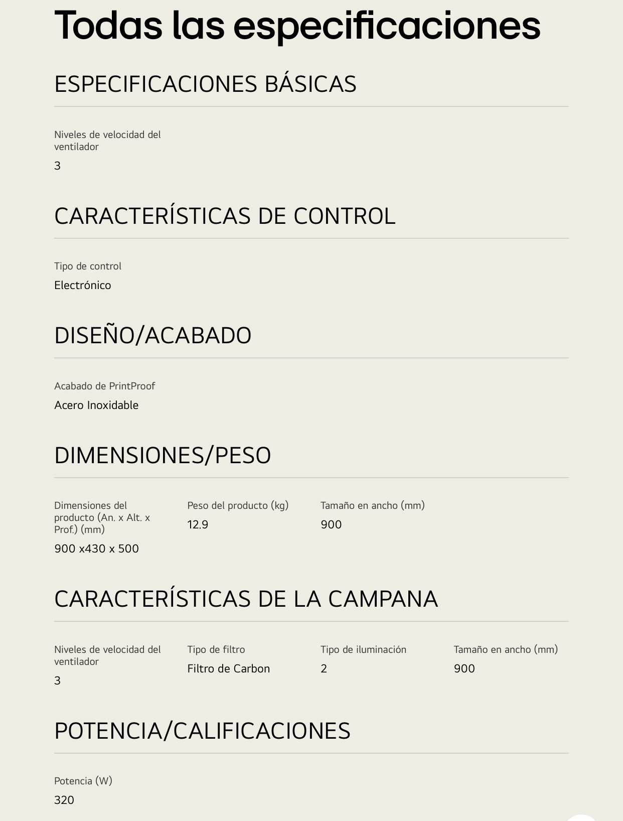 Campana Extractora LG 90cm c/filtro de 4 capas y carbón.